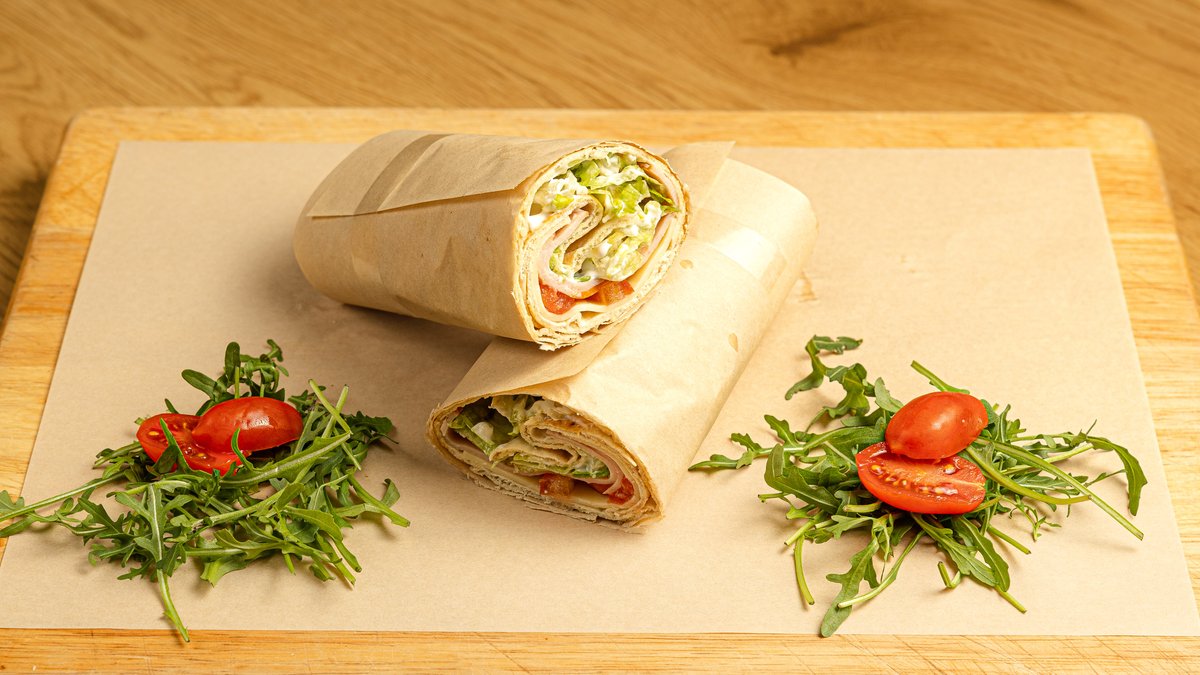 Με gouda, Philadelphia, γαλοπούλα, αυγό βραστό, ντομάτα και μαρούλι. Συνοδεύεται από πατάτες τηγανητές