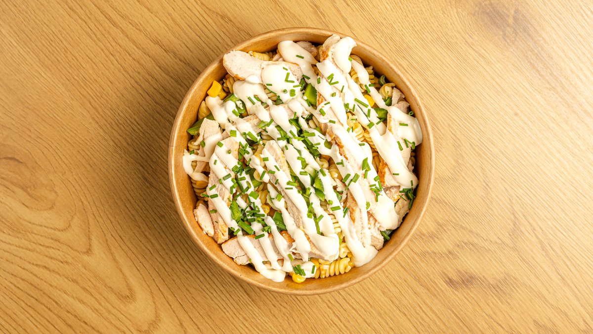 Σαλάτα με βίδες, φιλέτο κοτόπουλο, πολύχρωμες πιπεριές, καλαμπόκι, κρεμμύδι, άνηθο και sauce μαγιονέζα
