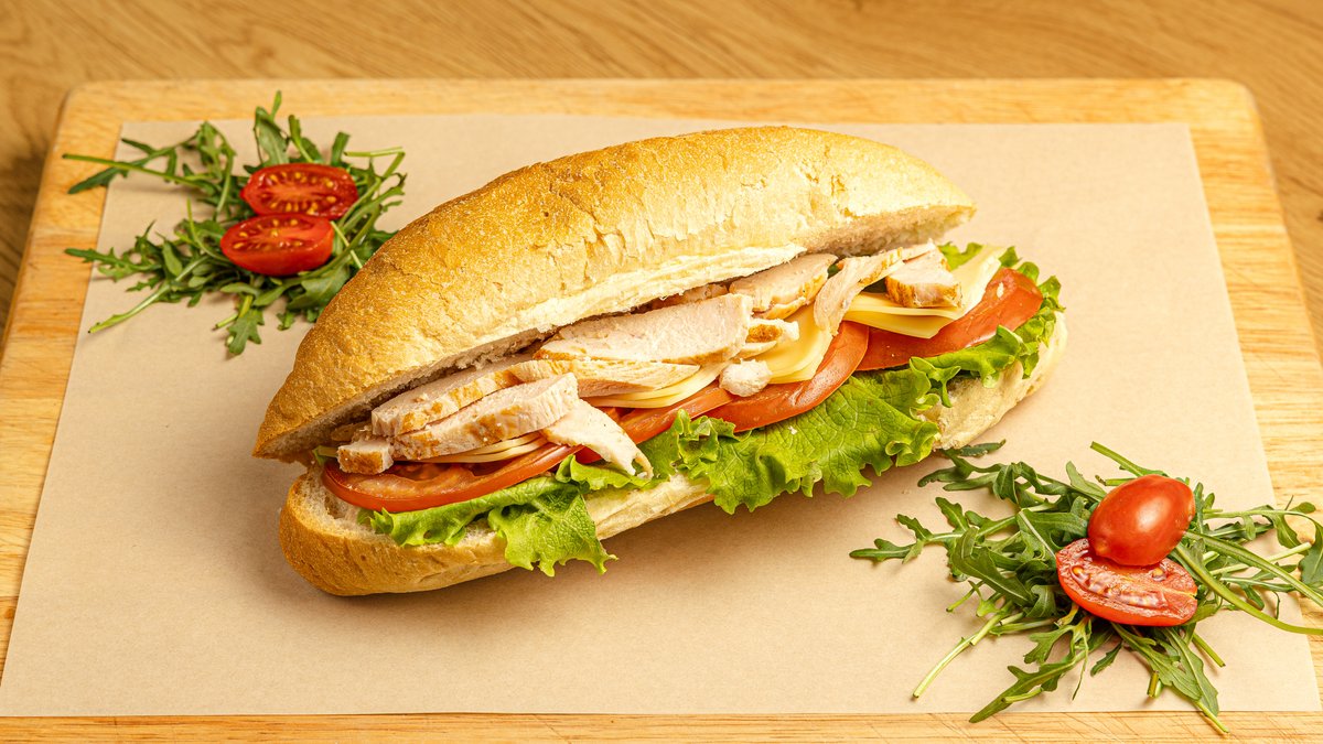 Με φιλέτο κοτόπουλο, gouda, ντομάτα, κρεμμύδι, iceberg και μαγιονέζα