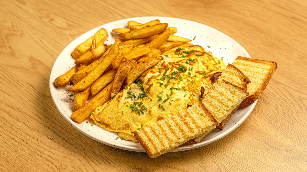 Με 3 αυγά, gouda, ζαμπόν, μπέικον, ντομάτα και πατάτες τηγανητές. Συνοδεύεται από ψωμί ψημένο και πατάτες τηγανητές