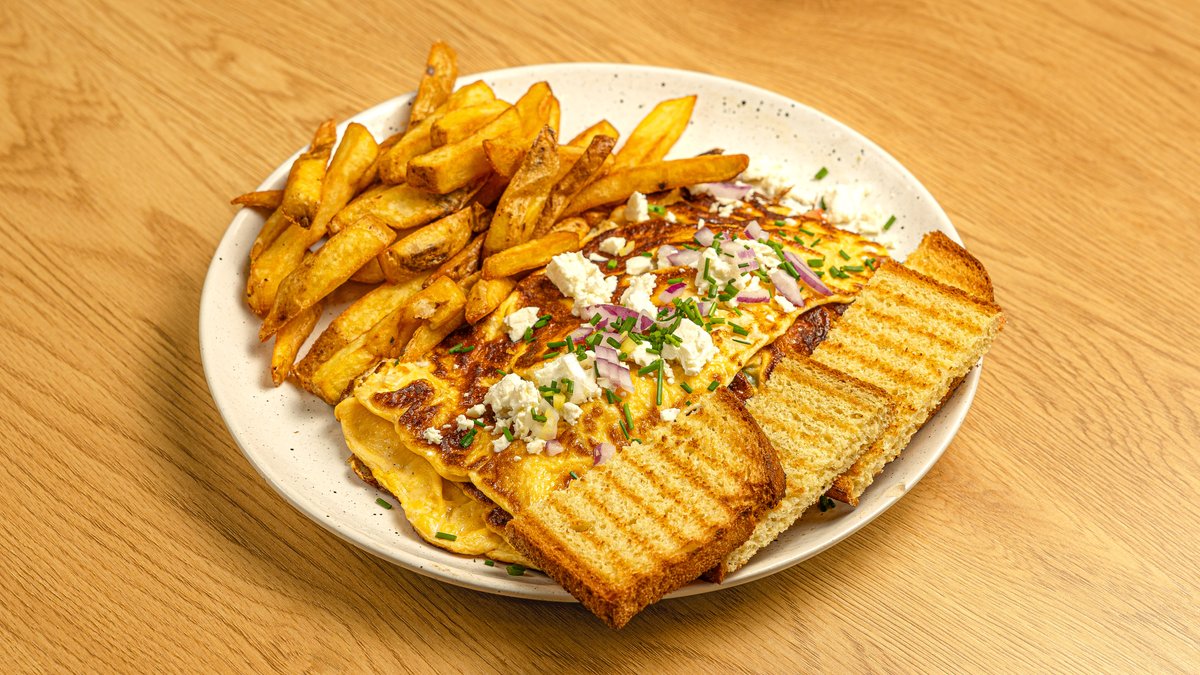 Με 3 αυγά, gouda, φέτα, ντομάτα, πράσινη πιπεριά, κρεμμύδι και ελιά. Συνοδεύεται από ψωμί ψημένο και πατάτες τηγανητές