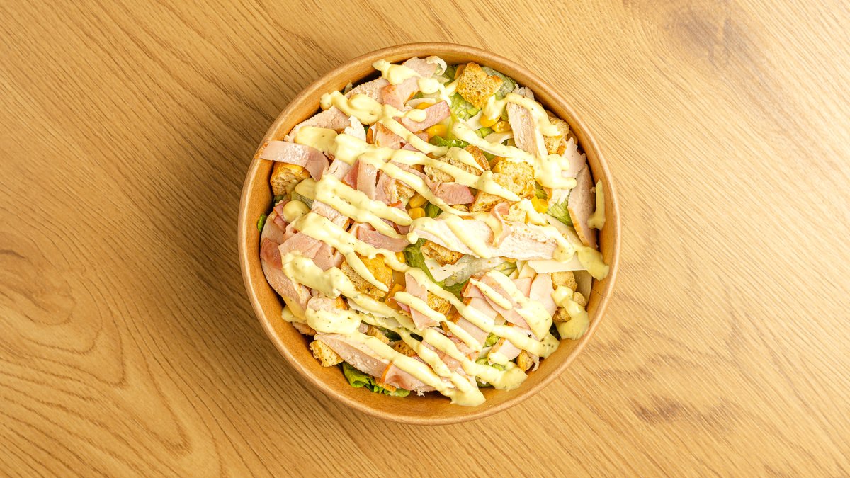 Με κοτόπουλο, μπέικον, παρμεζάνα, iceberg, καλαμπόκι και Caesar`s sauce