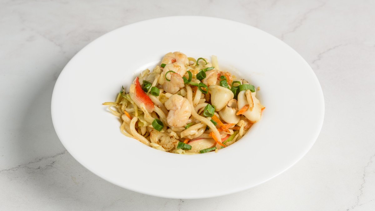 Udon noodles, θαλασσινά, λαχανικά και αυγό