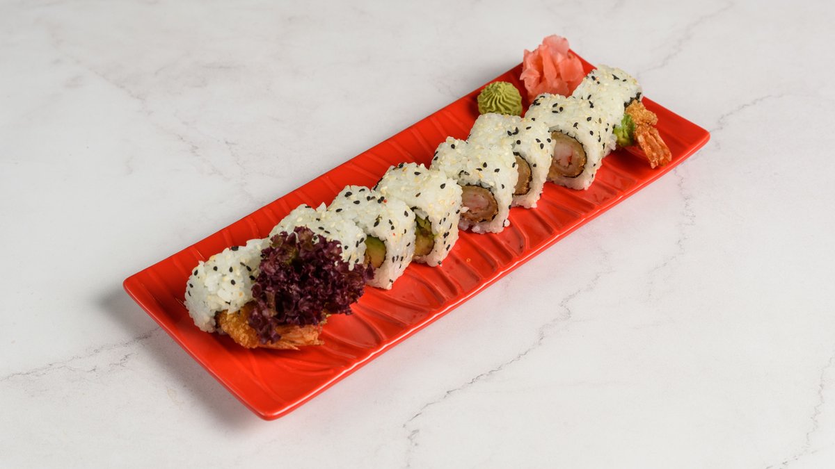 8τμχ. Ρολό με τηγανητές γαρίδες, αβοκάντο, φιλαδέλφεια, τεμπούρα και spicy mayo topping