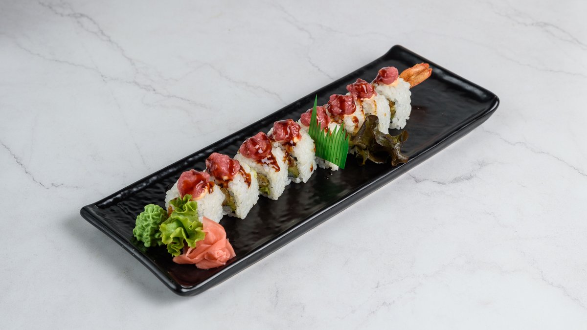 8τμχ. Μέσα με τηγανητές γαρίδες και αβοκάντο και φιλαδέλφεια. Έξω με ωμό τόνο, spicy mayo και teriyaki sauce