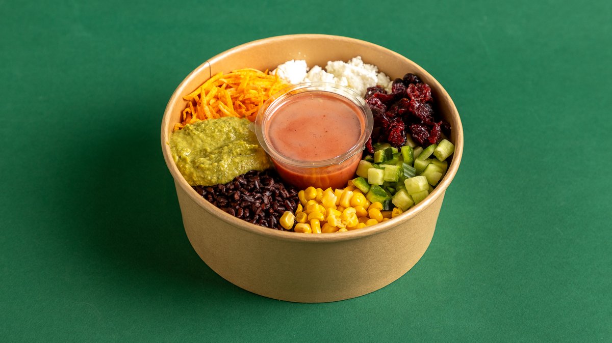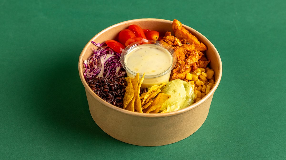 Με μαριναρισμένο κοτόπουλο, mix λαχανικών, guacamole, μαύρο ρύζι, κόκκινο λάχανο, καλαμπόκι, ντοματίνια, nachos και coconut-lime sauce