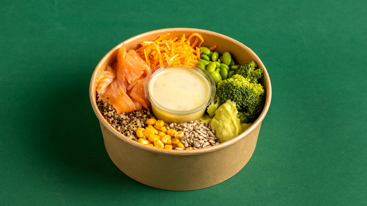 Σαλάτα με καπνιστό σολομό, γουακαμόλε, iceberg, καρότο, καλαμπόκι, φασόλια edamame, κινόα τρίχρωμη, μπρόκολο, ηλιόσπορο, coconut sauce