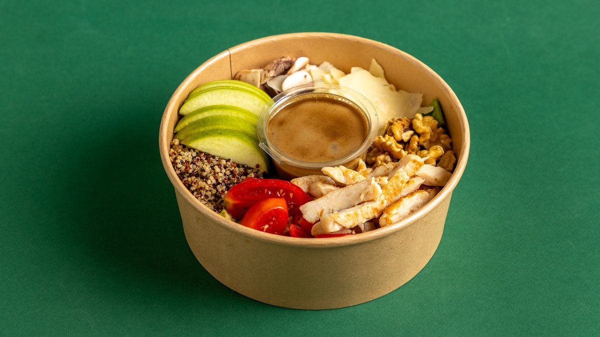 Με κοτόπουλο, mix λαχανικών, τρίχρωμη κινόα, μανιτάρια, παρμεζάνα, καρύδια, ντοματίνια, πράσινο μήλο και trufa balsamic sauce