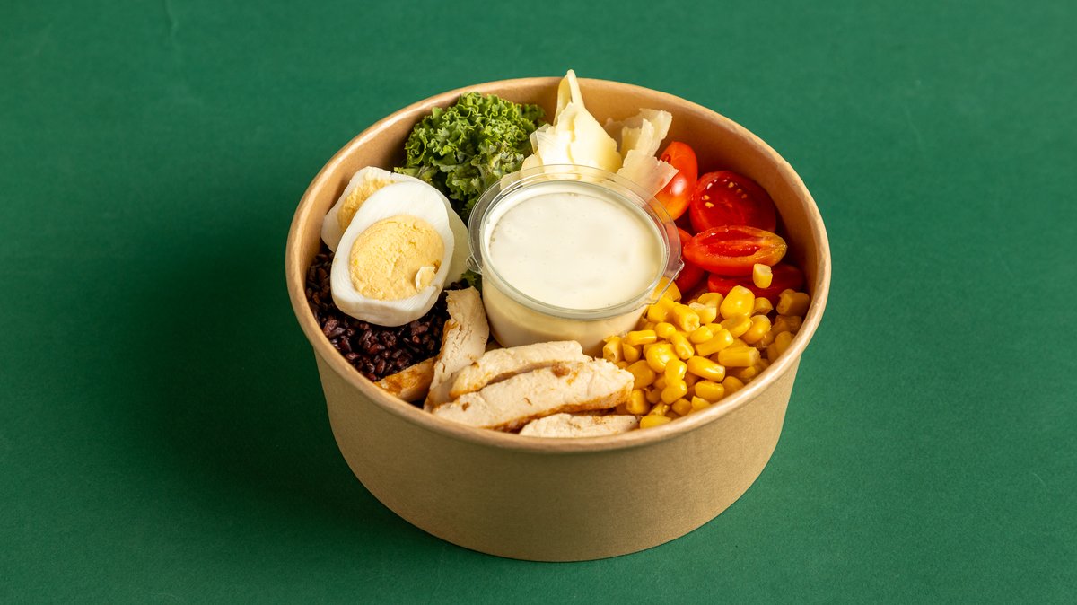 Σαλάτα με iceberg, kale, κοτόπουλο, μαύρο ρύζι, καλαμπόκι, αυγό, ντοματίνια, παρμεζάνα και Caesar`s sauce