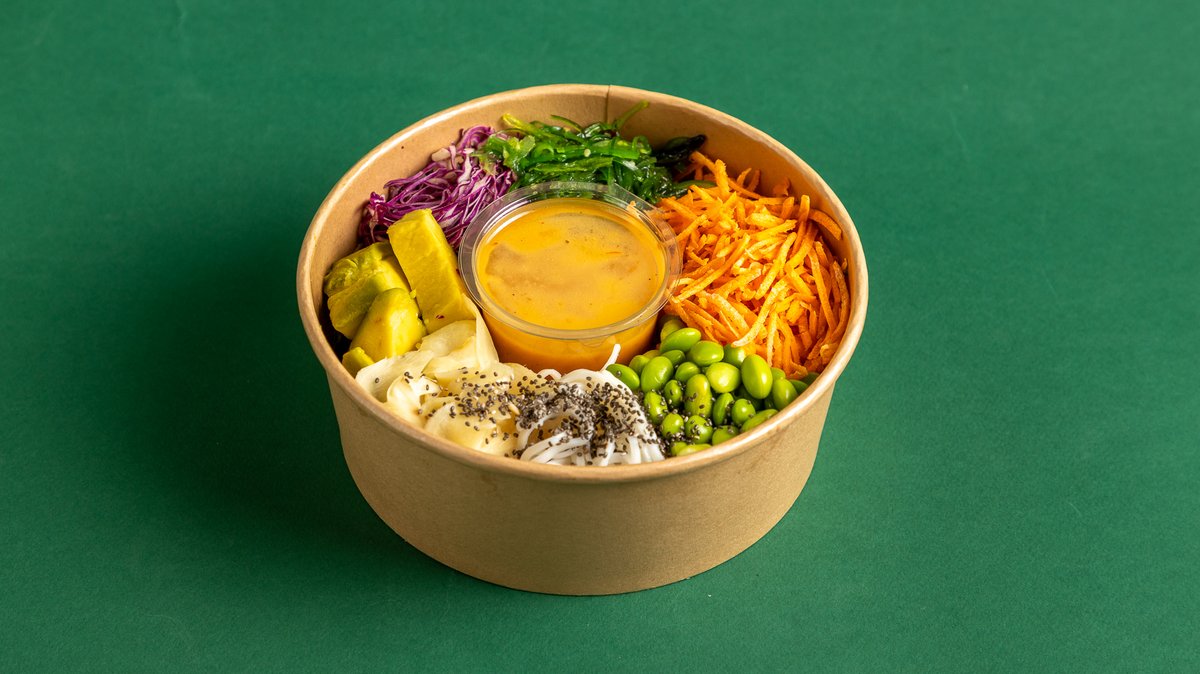 Vegan. Σαλάτα με φασόλια edamame, φύκια wakame, noodles ρυζιού, iceberg, αβοκάντο, καρότο - ginger, κόκκινο λάχανο, σπόρους chia και sweet chili sauce