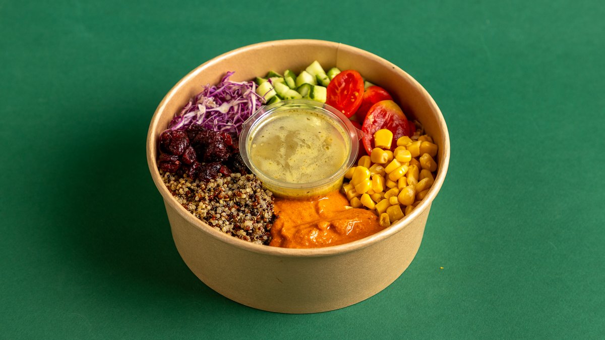 Vegan. Με τρίχρωμη κινόα, iceberg, χούμους καπνιστής πιπεριάς, κόκκινο λάχανο, ντοματίνια, αγγούρι, καλαμπόκι, cranberries, herbs and lemon sauce