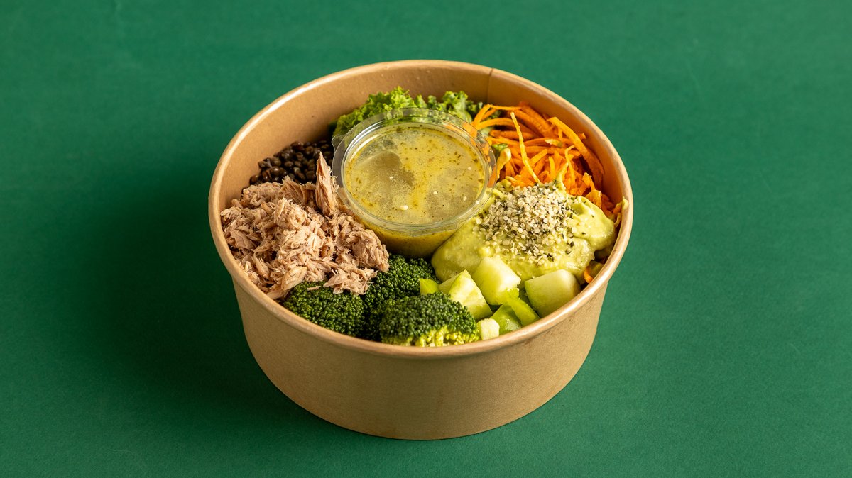 Σαλάτα με τόνο, mix σαλατικών, φακές, γουακαμόλε, μπρόκολο, πράσινο μήλο, kale, νιφάδες κάνναβης, herbs and lemon sauce