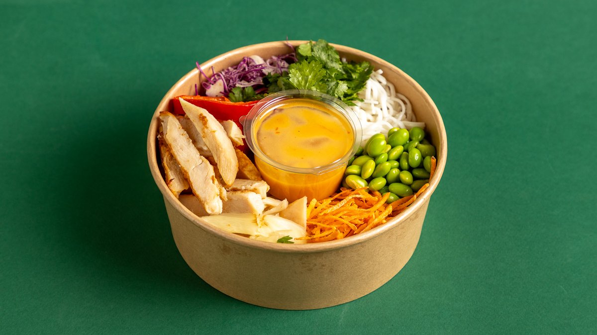 Σαλάτα με κοτόπουλο, iceberg, noodles ρυζιού, κόκκινο λάχανο, κόκκινη πιπεριά Φλωρίνης, φασόλια edamame, καρότο - ginger, κόλιανδρο και sweet chili sauce