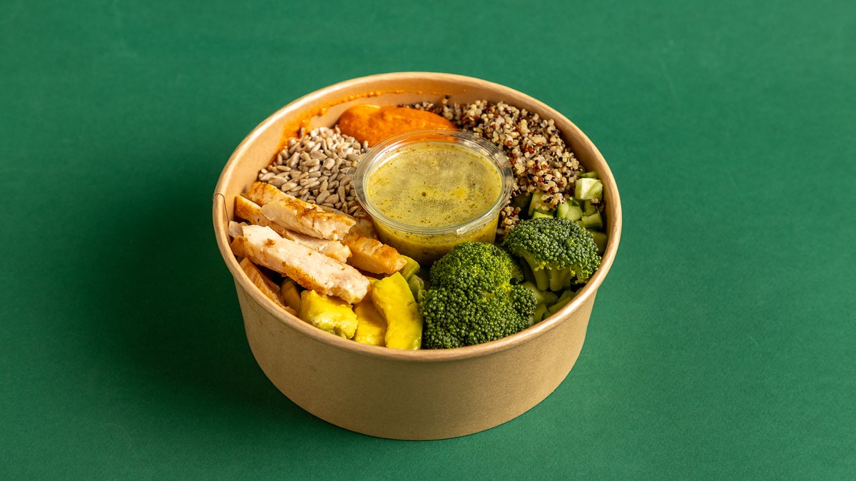 Σαλάτα με κοτόπουλο, χούμους κόκκινης πιπεριάς, quinoa τρίχρωμη, iceberg, μπρόκολο, αβοκάντο, ηλιόσπορο, αγγούρι, herbs and lemon sauce