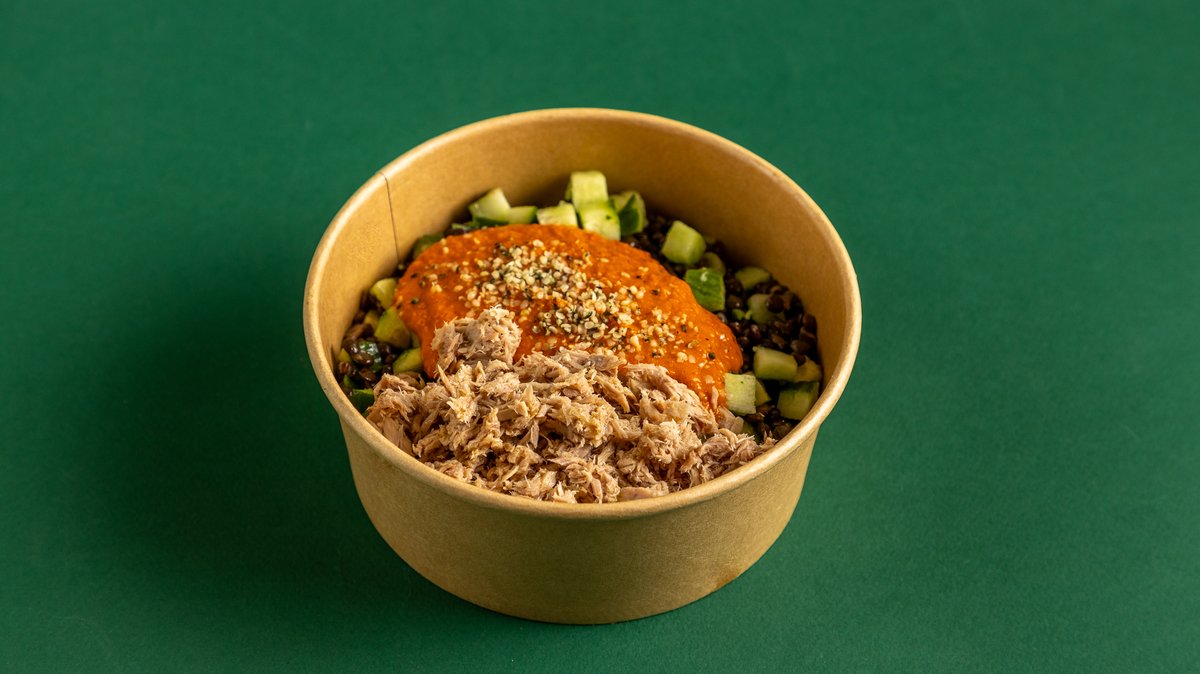 Με φακές, τόνο, αγγούρι, σπόρους κάνναβης, χούμους πιπεριάς Φλωρίνης, φρέσκο κρεμμυδάκι και λαδολέμονο
