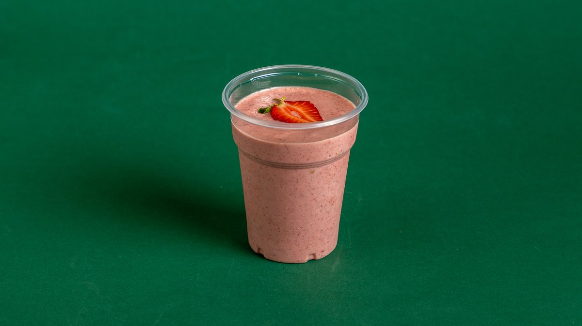 Vegan. Αμυγδαλοβούτυρο, χουρμάς, φράουλα, μπανάνα, βανίλια, κανέλα, γάλα αμυγδάλου, maca
