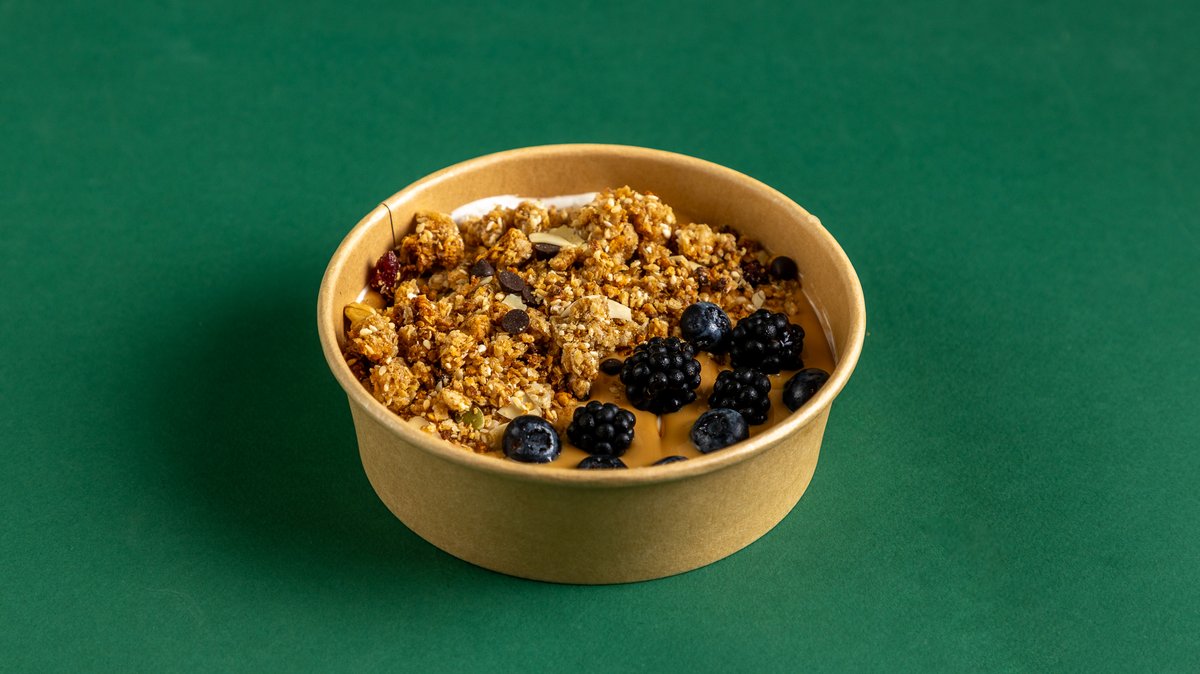 Με γιαούρτι 5%, berries, chia, vegan granola με σοκολάτα υγείας και κρέμα φυστικοβούτυρο