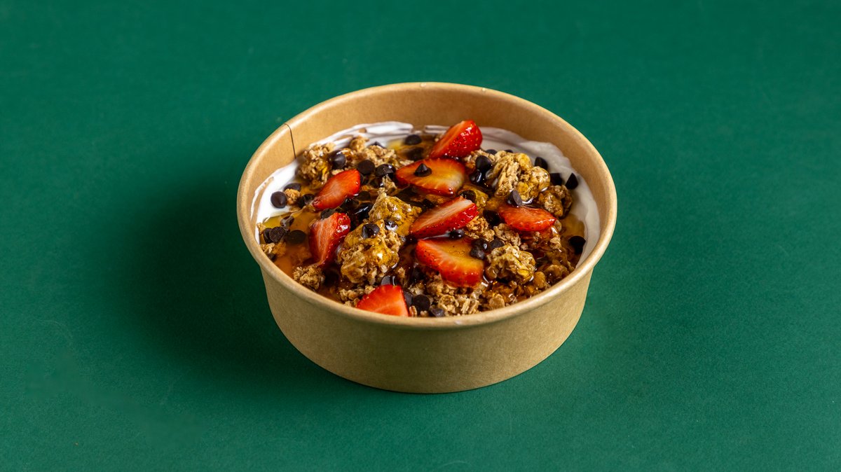 Με γιαούρτι 5%, granola, φράουλα, μέλι ανθέων και σοκολάτα υγείας