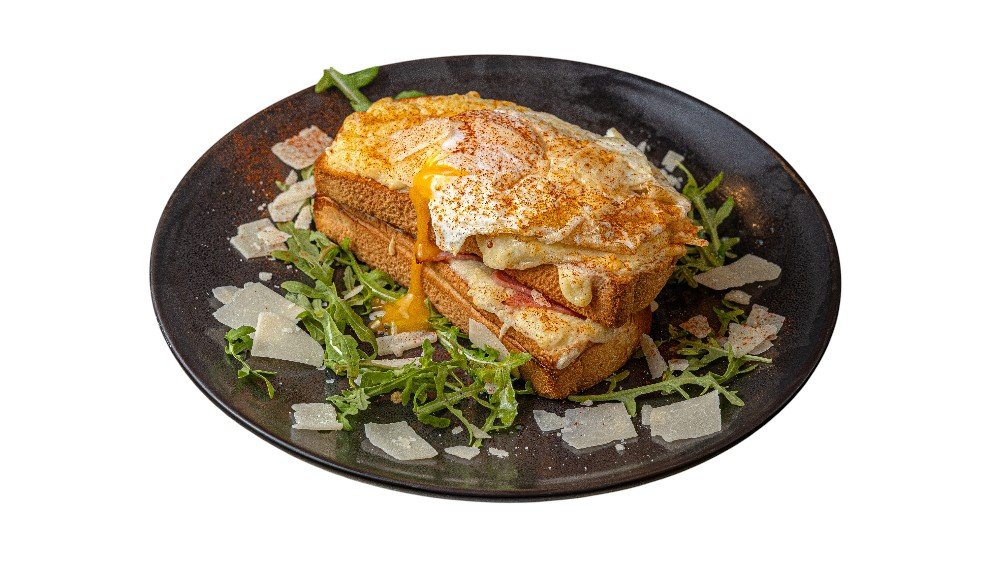 Ψωμί brioche, ζαμπόν, τυρί ementalle, bechamel, τηγανητό αυγό και chives