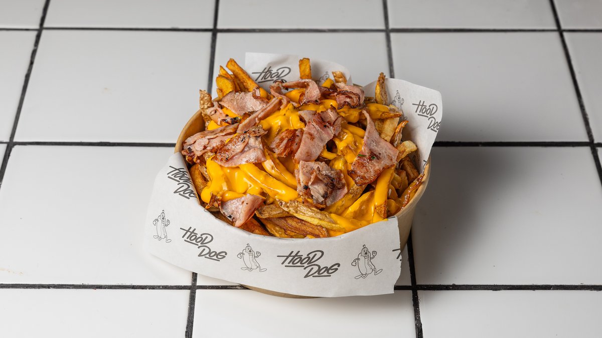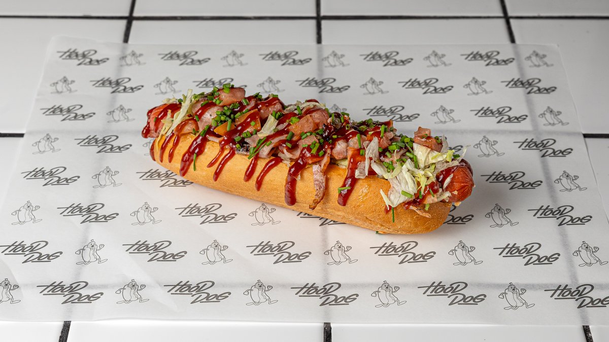 Λουκάνικο Φρανκφούρτης, bacon, ντομάτα, καραμελωμένο κρεμμύδι και bbq σως