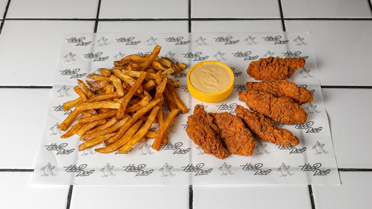 6 φιλέτα κοτόπουλο. Συνοδεύεται από πατάτες και σως μουστάρδας