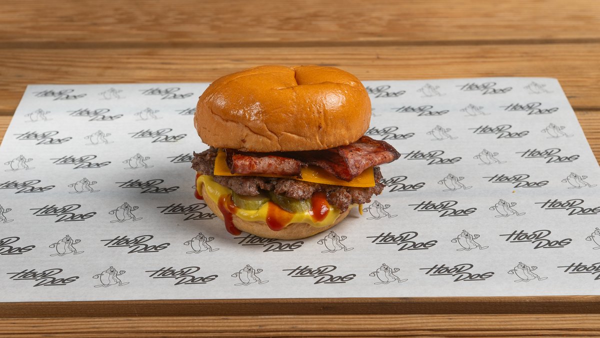 Με μπιφτέκι, τσένταρ, μπέικον, ντομάτα, πίκλα, κέτσαπ και μουστάρδα