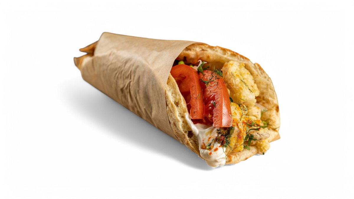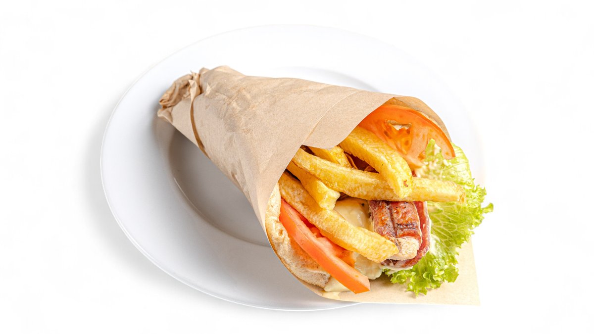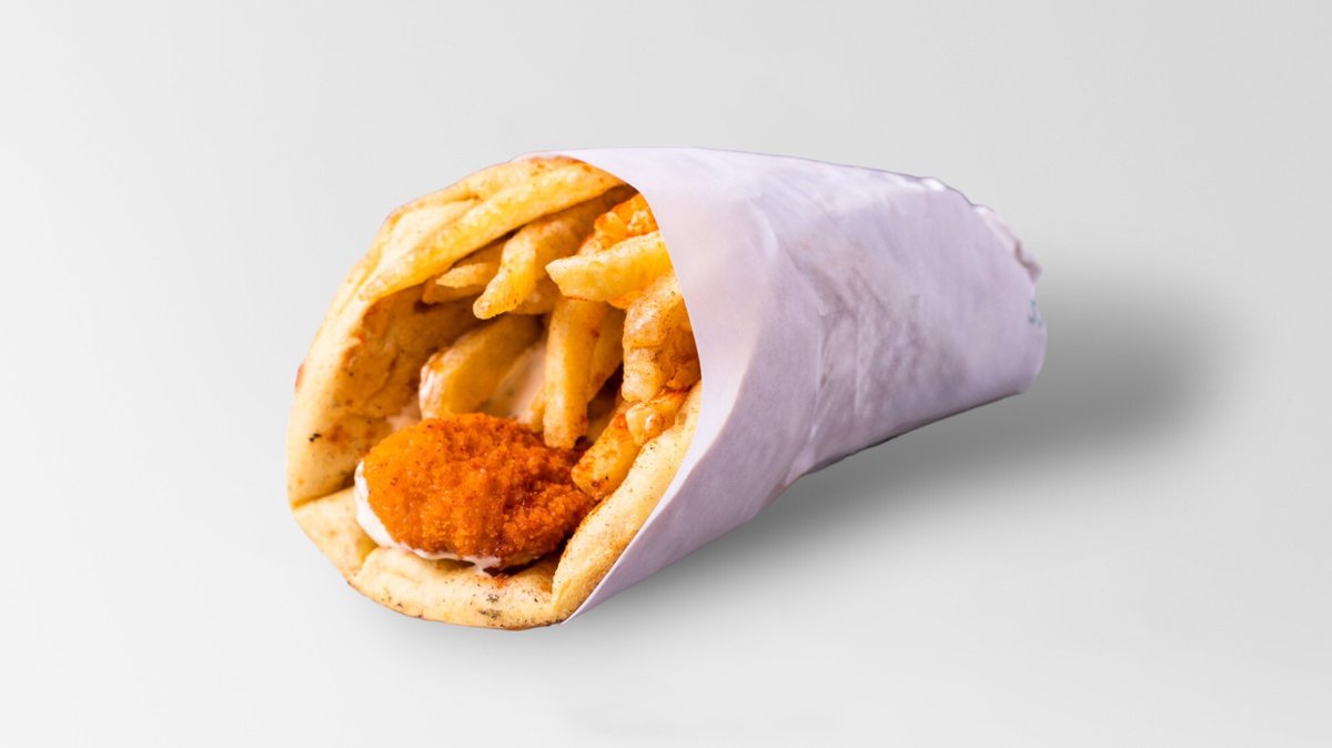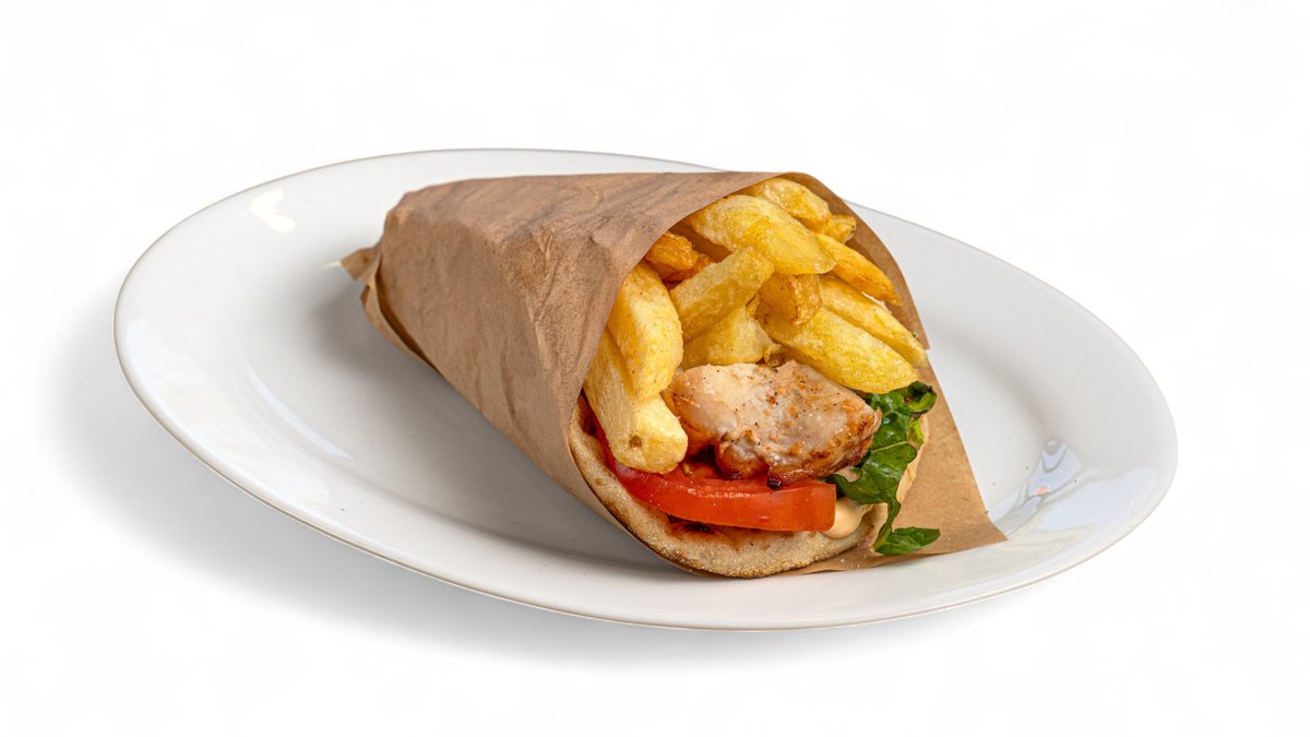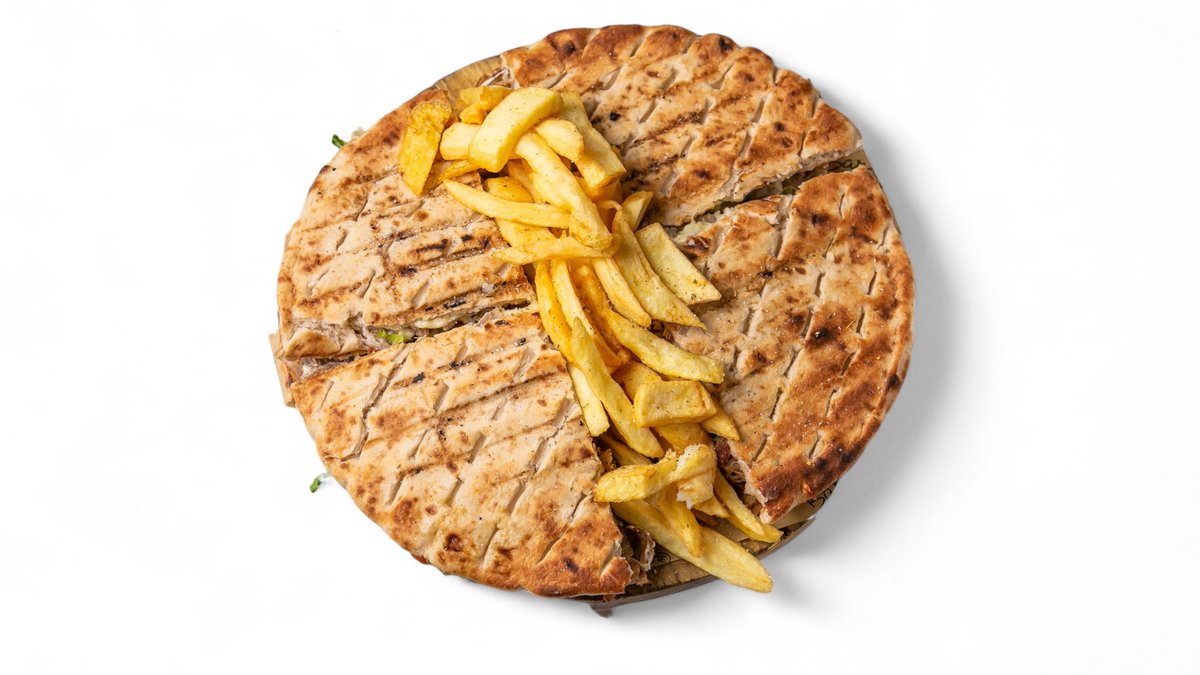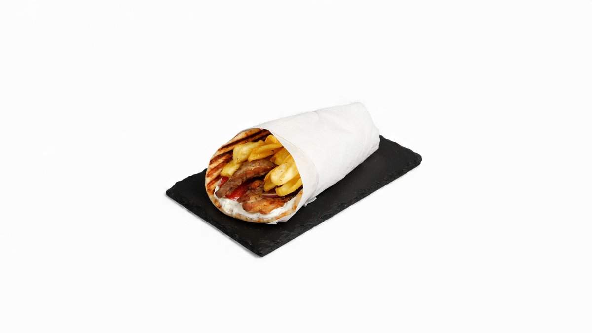 Συνοδεύεται από πατάτες τηγανητές, ντομάτα, λάχανο, καρότο, πίτα και sauce