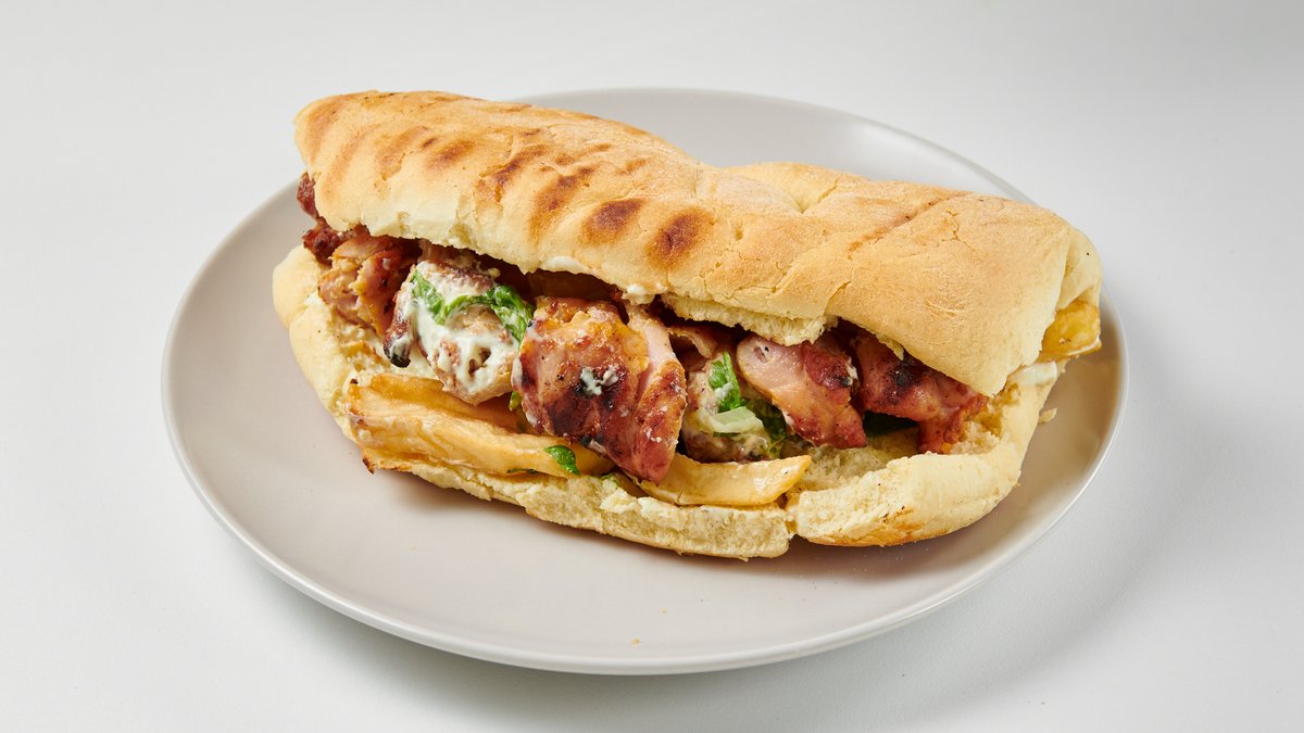 Με μπιφτέκι κοτόπουλο, ντομάτα, μαρούλι, κρεμμύδι, cheddar, bacon και sauce μουστάρδας. Συνοδεύεται από πατάτες τηγανητές