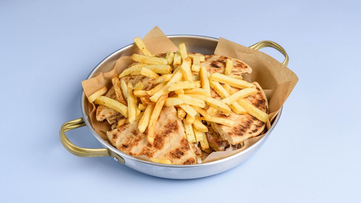 Σκεπαστή γύρος κοτόπουλο με υλικά της επιλογής σου. Συνοδεύεται από πατάτες τηγανητές