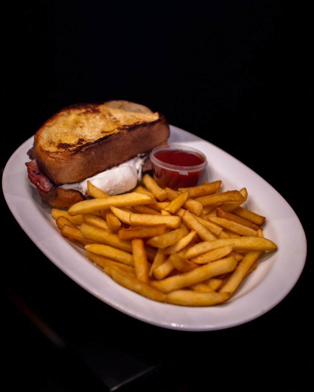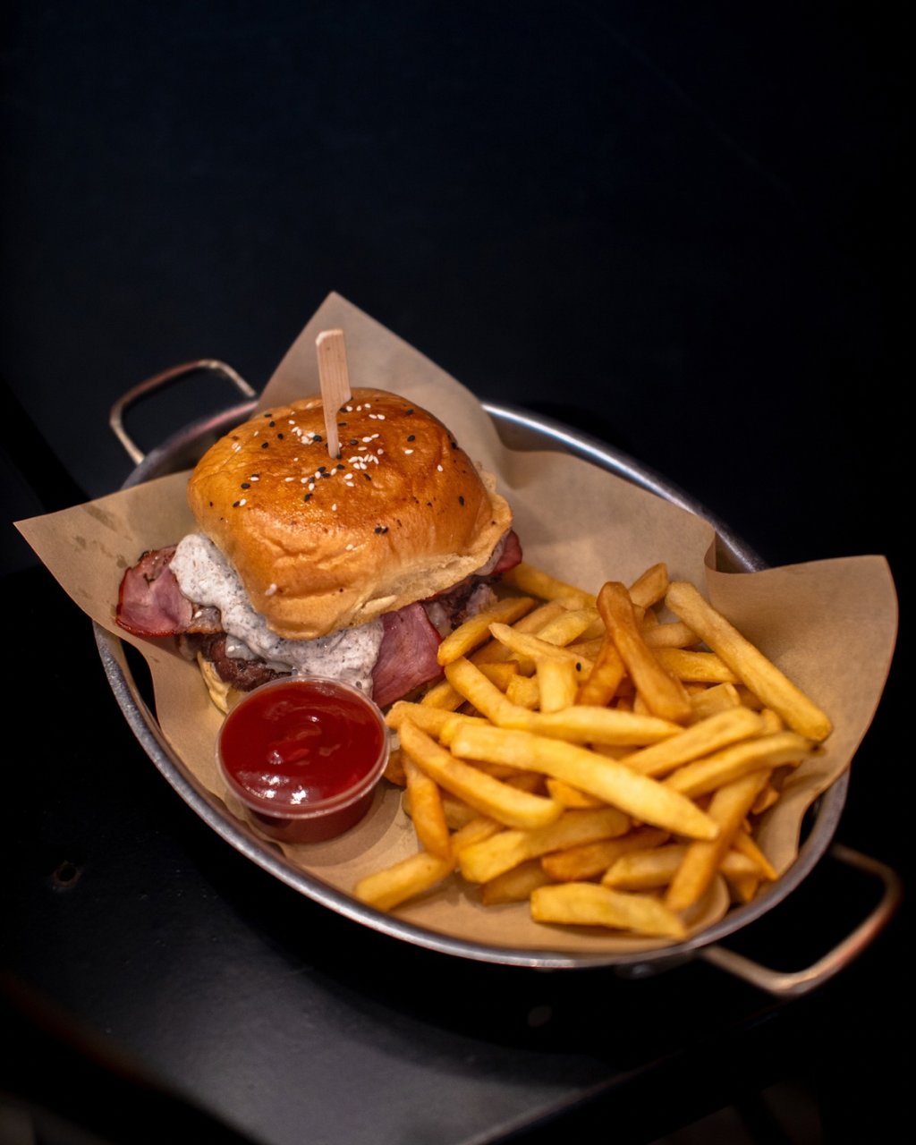 Ψωμί brioche με λουκάνικο, καραμελωμένο κρεμμύδι, chips μπέικον, λάχανο ketchup και μουστάρδα. Συνοδεύεται από πατάτες τηγανητές