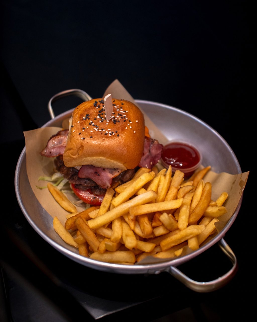 Ψωμάκι πατάτας με διπλό smashed μπιφτέκι 100g από 100% μοσχαρίσιο κιμά, sauce φέτα, καπνιστό μπέικον, μαρμελάδα τριαντάφυλλο, πίκλες, sweet chili sauce
