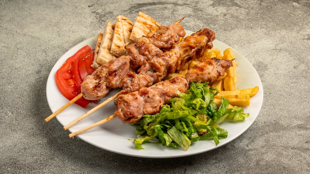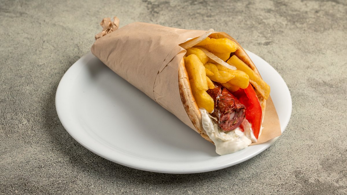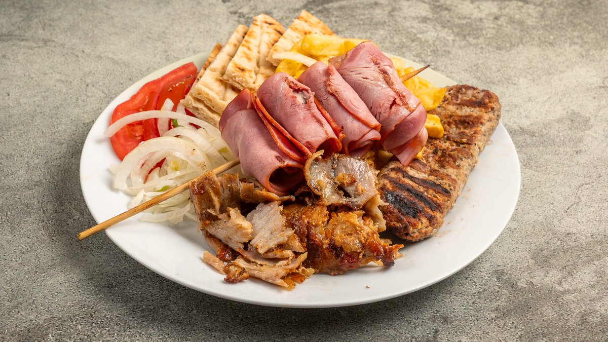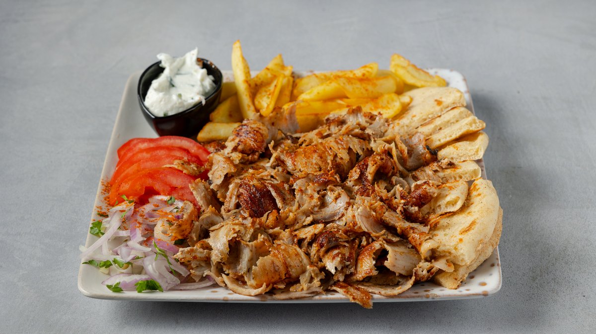 Συνοδεύεται από 2 πίτες, πατάτες τηγανητές, ντομάτα, κρεμμύδι και τζατζίκι