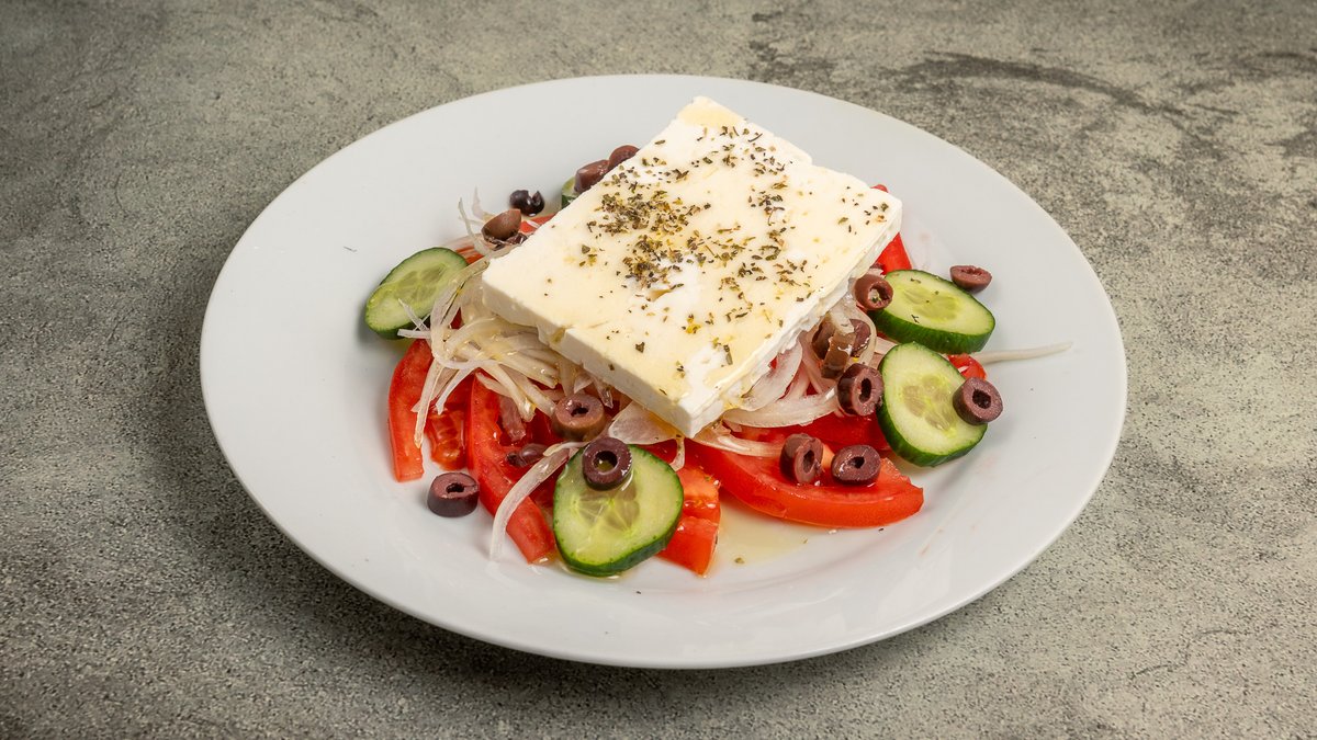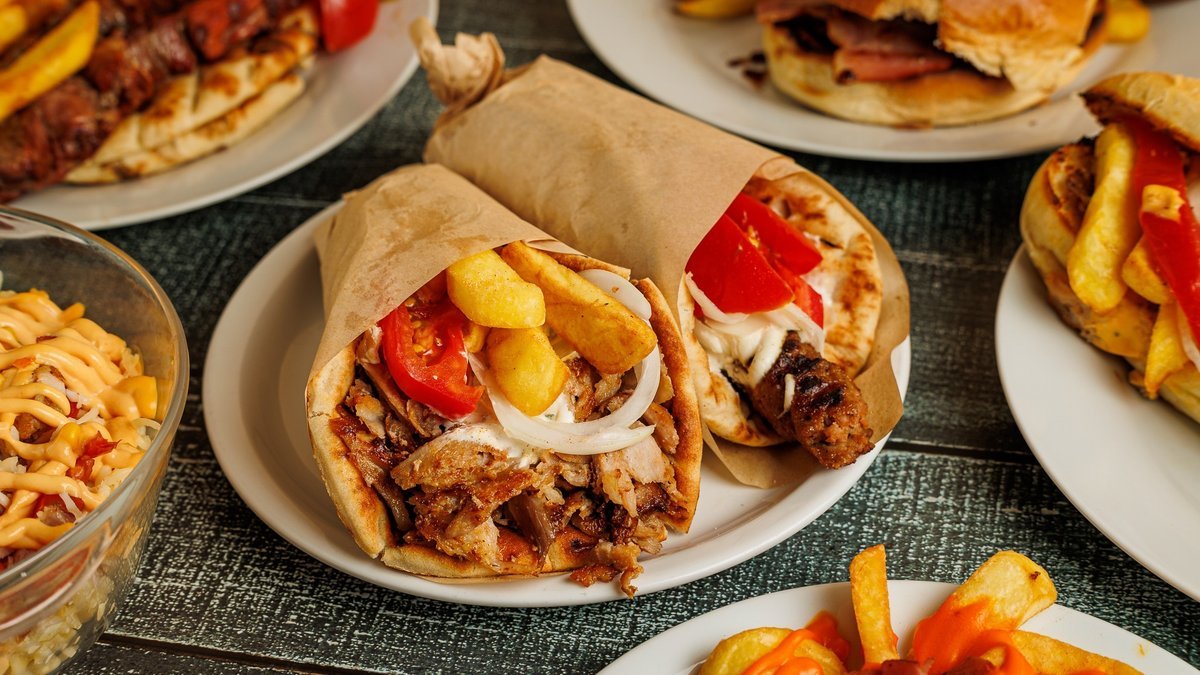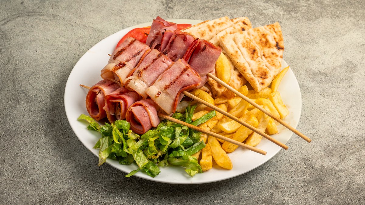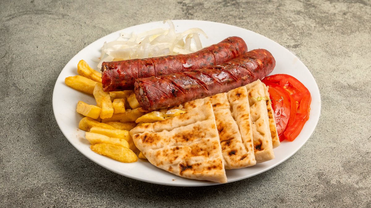Συνοδεύεται από 2 πίτες, πατάτες τηγανητές, ντομάτα, κρεμμύδι και τζατζίκι