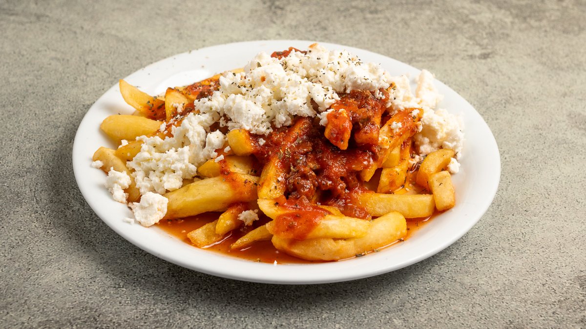 Με διπλό γύρο χοιρινό, πατάτες, διπλή σως γιαουρτιού, μίνι πίτα και διπλή cheddar sauce