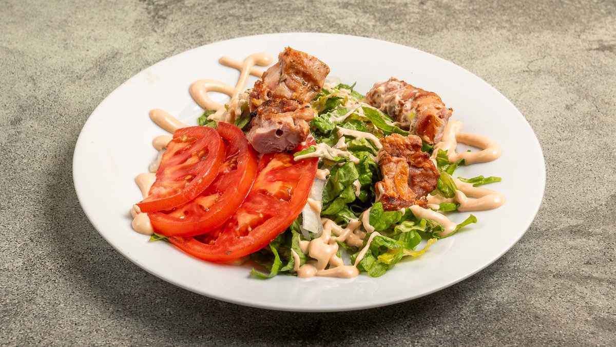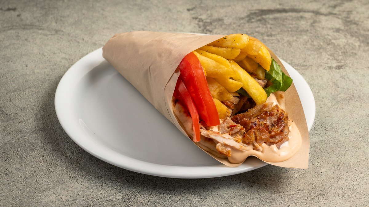 Συνοδεύεται από 2 πίτες πατάτες τηγανητές, ντομάτα, μαρούλι και σως γιαουρτιού