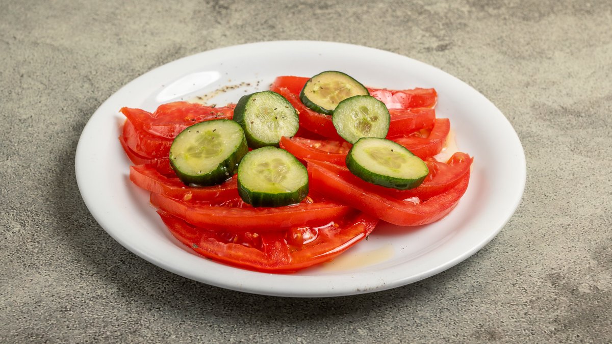 Με υλικά ντομάτα, κρεμμύδι, πατάτες, τζατζίκι και πίτες