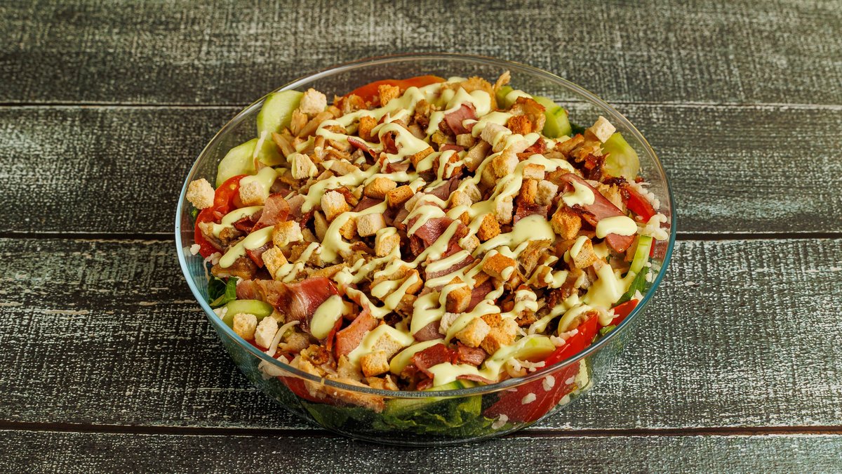 Με μαγιονέζα. ντομάτα. μαρούλι, cheddar sauce. Συνοδεύεται από πατάτες και ντιπ sauce cocktail.