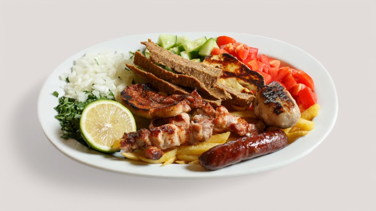Με 2 καλαμάκια χοιρινά, 2 καλαμάκια κοτόπουλο, 2 κοτομπέικον, 2 μπιφτέκια μοσχαρίσια, 1 λουκάνικο χωριάτικο, γύρο χοιρινό και γύρο κοτόπουλ. Συνοδεύεται από 4 πίτες, πατάτες τηγανητές, ντομάτα, κρεμμύδι, τζατζίκι και σως