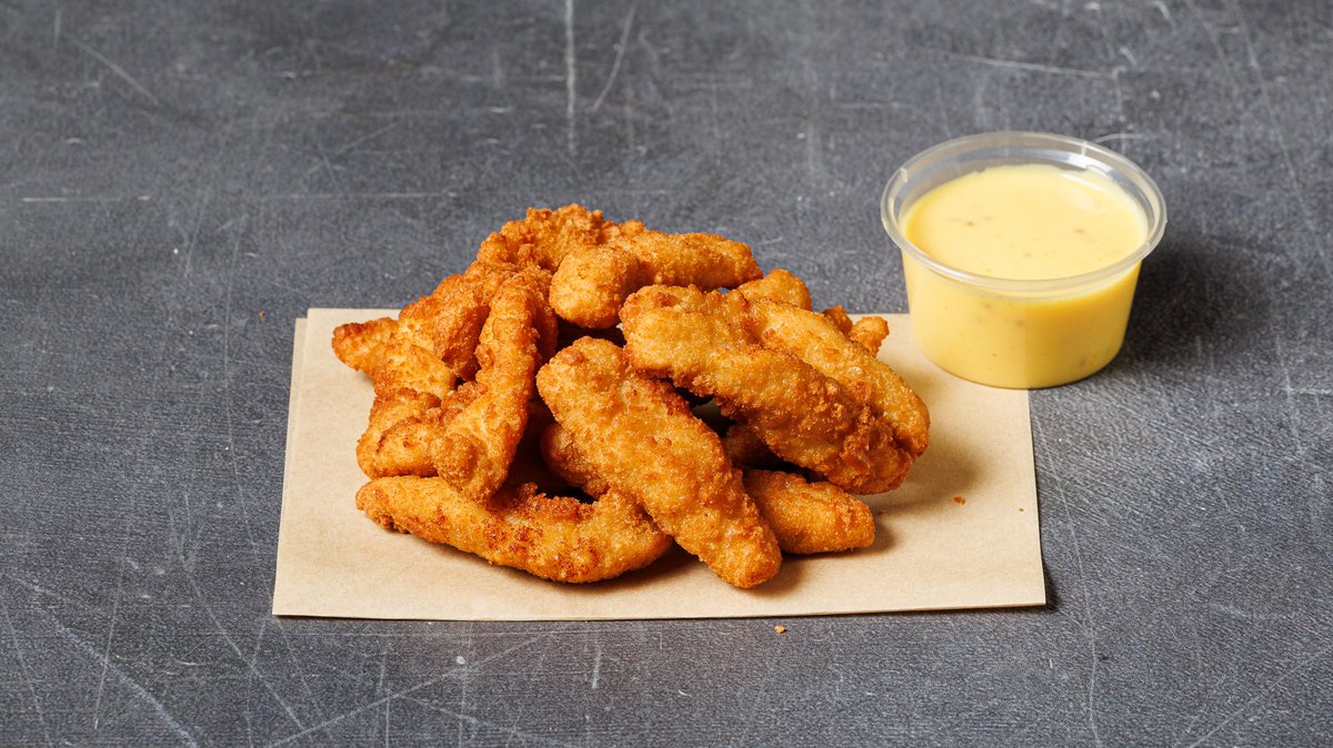 Φιλετάκια από στήθος κοτόπουλου πανέ. Συνοδεύονται από τηγανητές πατάτες και honey mustard sauce.