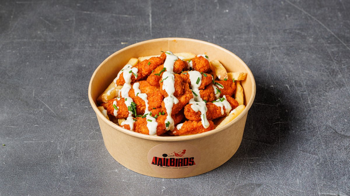 Με τηγανητές πατάτες, τραγανές μπουκίτσες από φιλέτο κοτόπουλο επικαλυμμένες με hot buffalo sauce, ranch dressing, queso cheese sauce και chives.
