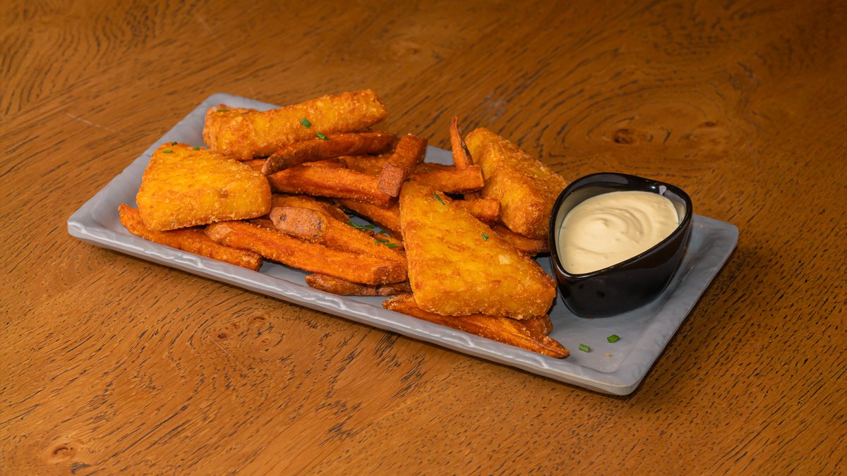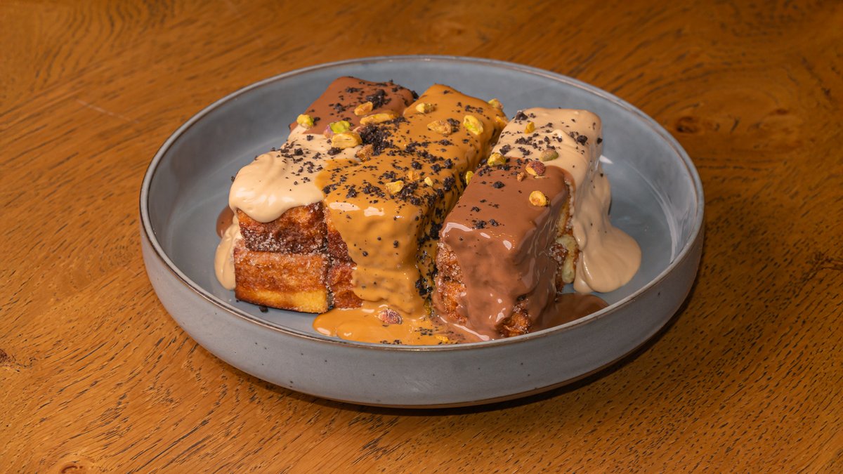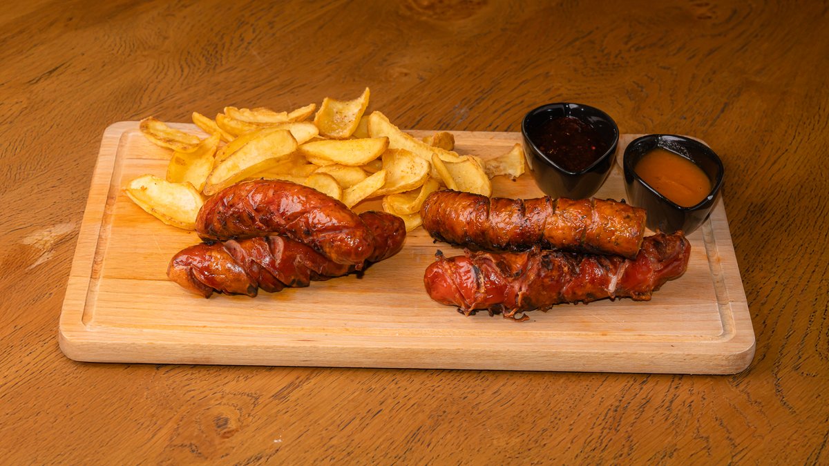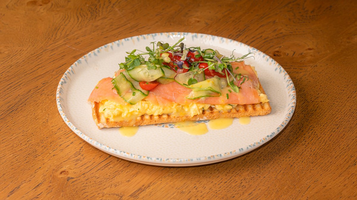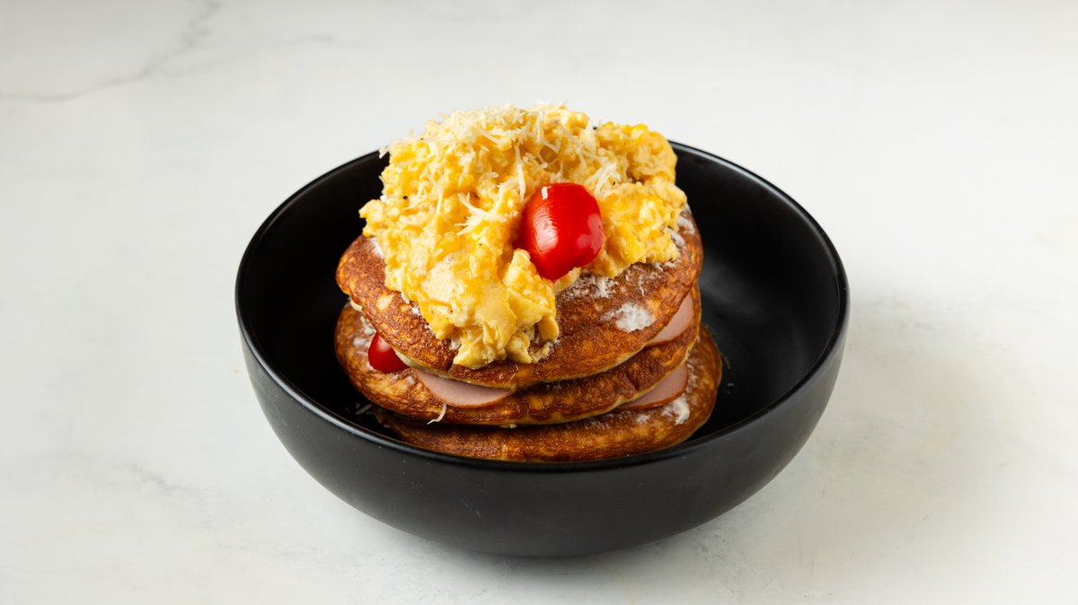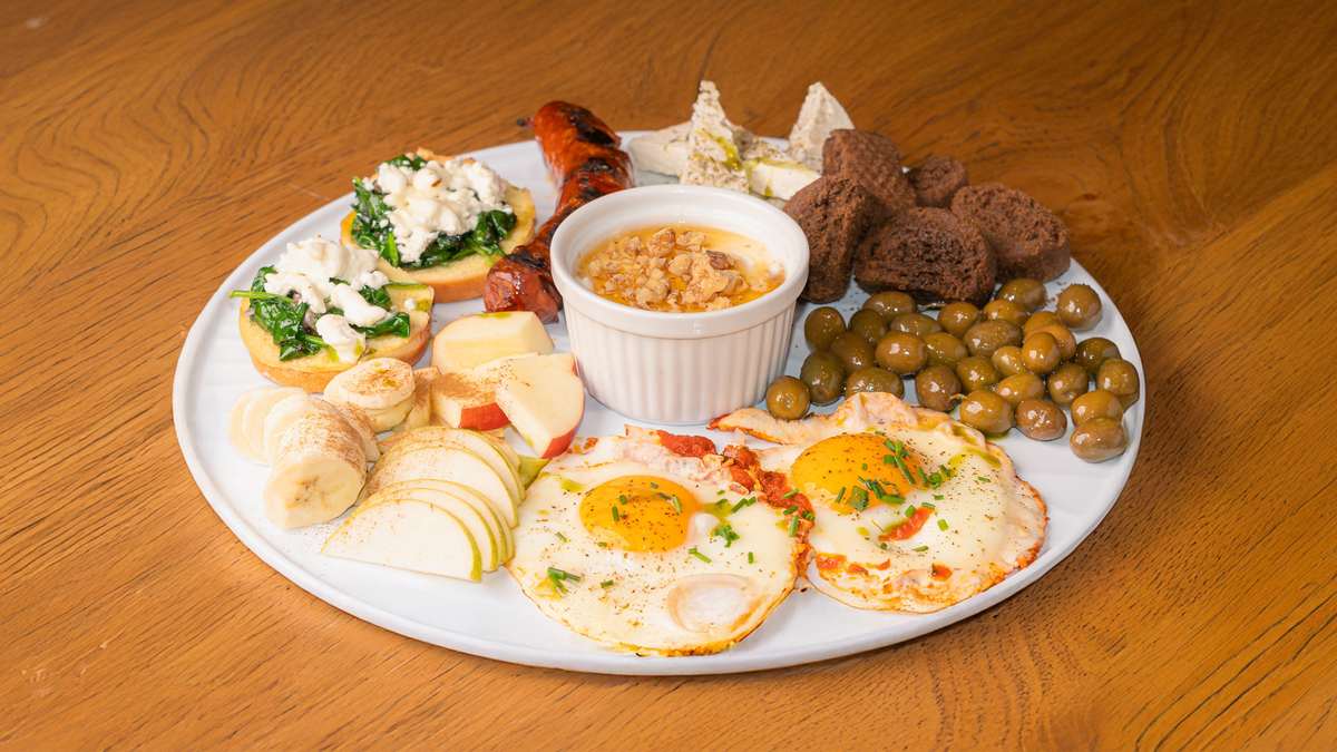 2-4 pancakes, 2-4 αυγά, 2-4 κρουασάν βουτύρου, 2-4 λουκάνικα κοτόπουλο ή χοιρινά, 2-4 φέτες γαλοπούλα, 2-4 φέτες gouda, 2 mini brioche σολομού, ανάμεικτα φρούτα (μπανάνα-μήλο-αχλάδι). Συνοδεύεται από nutella, μαρμελάδα βύσσινο, βούτυρο και μέλι