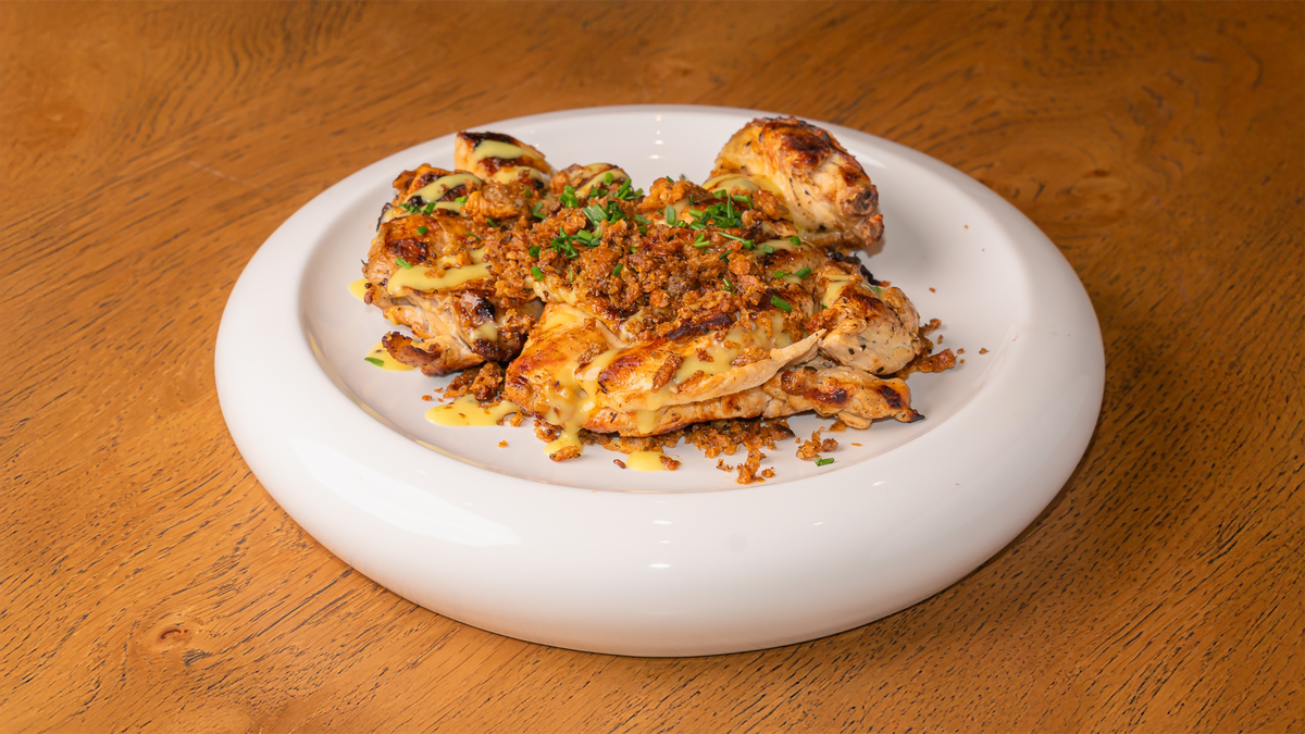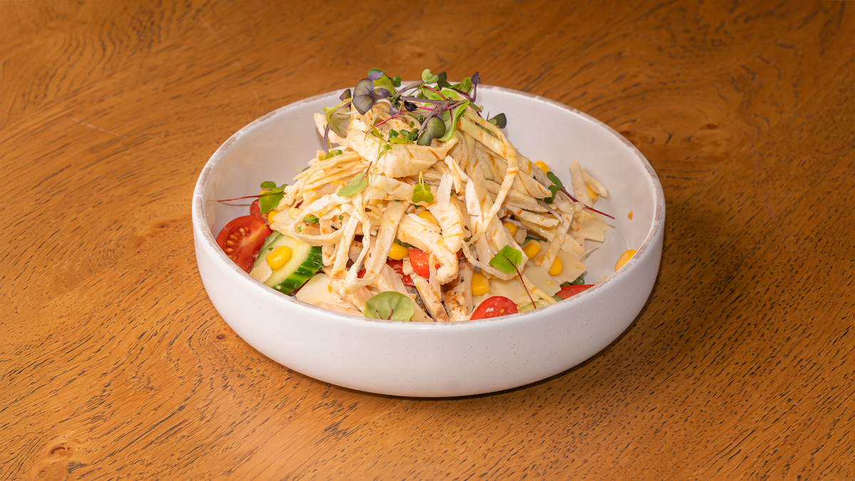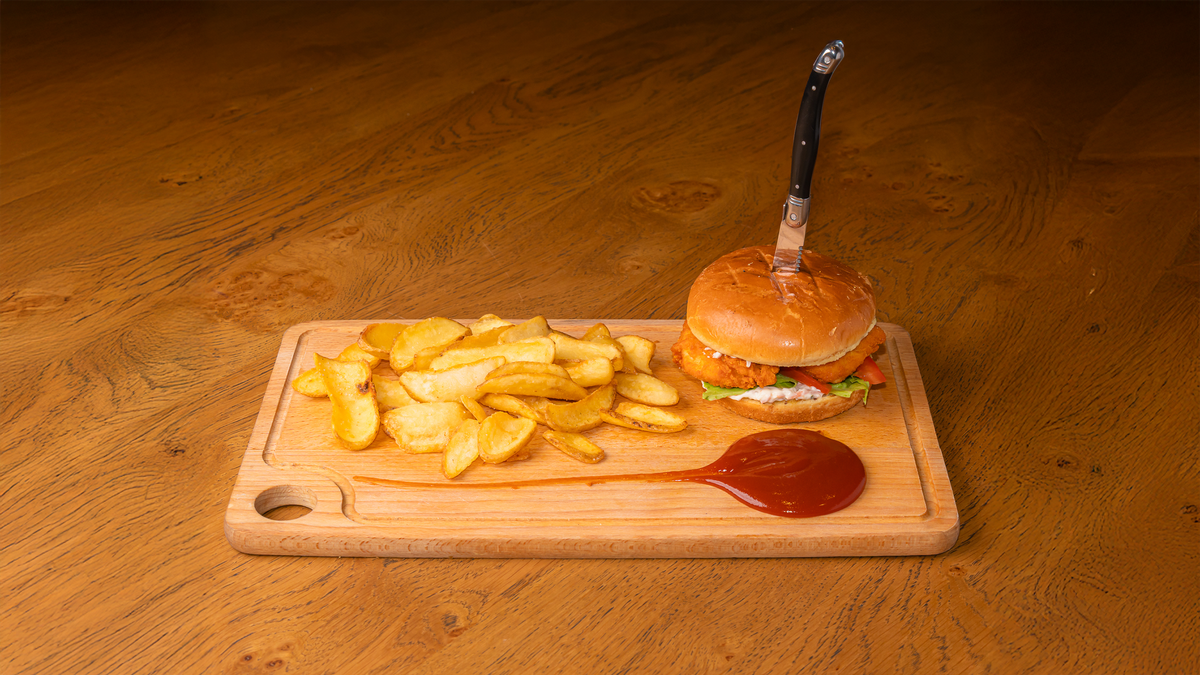 Με crispy κοτόπουλο παναρισμένο με δημητριακά, iceberg, ντομάτα, μαγιονέζα, μοτσαρέλα και γαλοπούλα. Συνοδεύεται από πατάτες