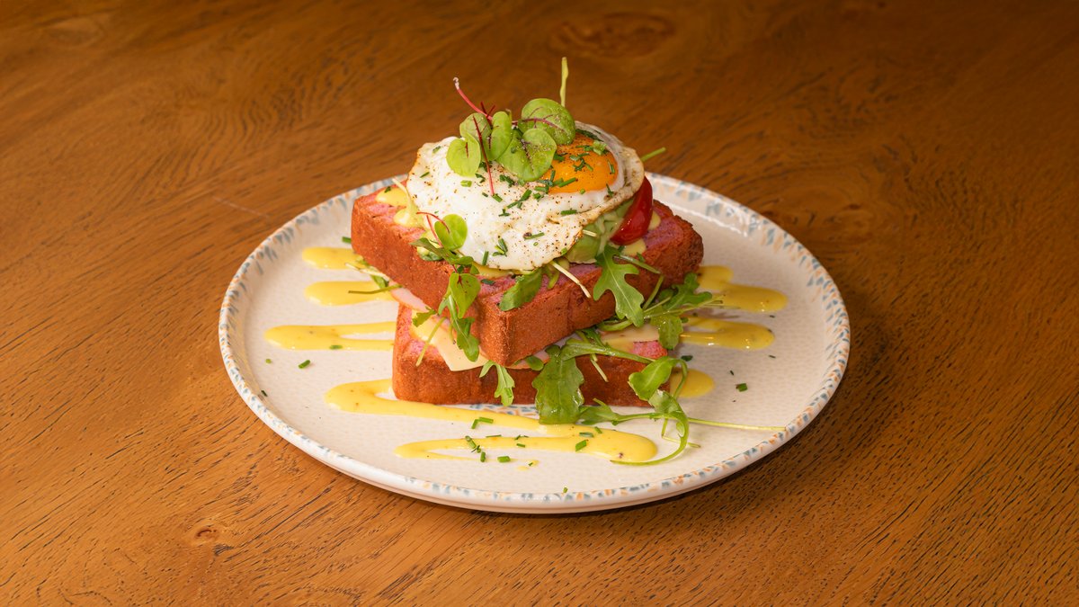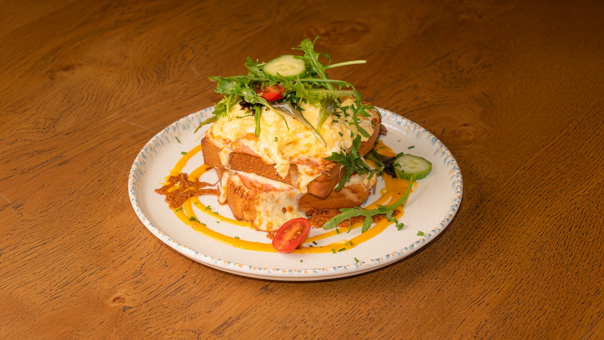 Ζυμωτό ψωμί, σπανάκι, άνηθος, φρέσκο κρεμμυδάκι, μπεσαμέλ, φέτα, τηγανητό αυγό