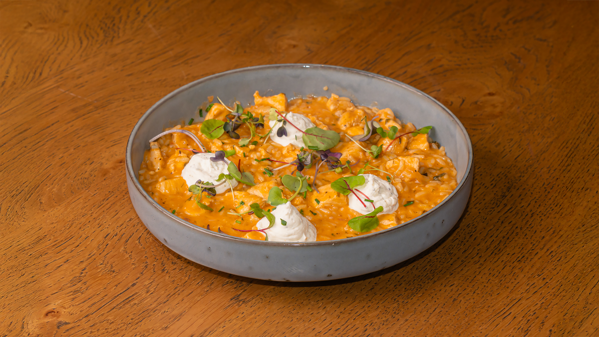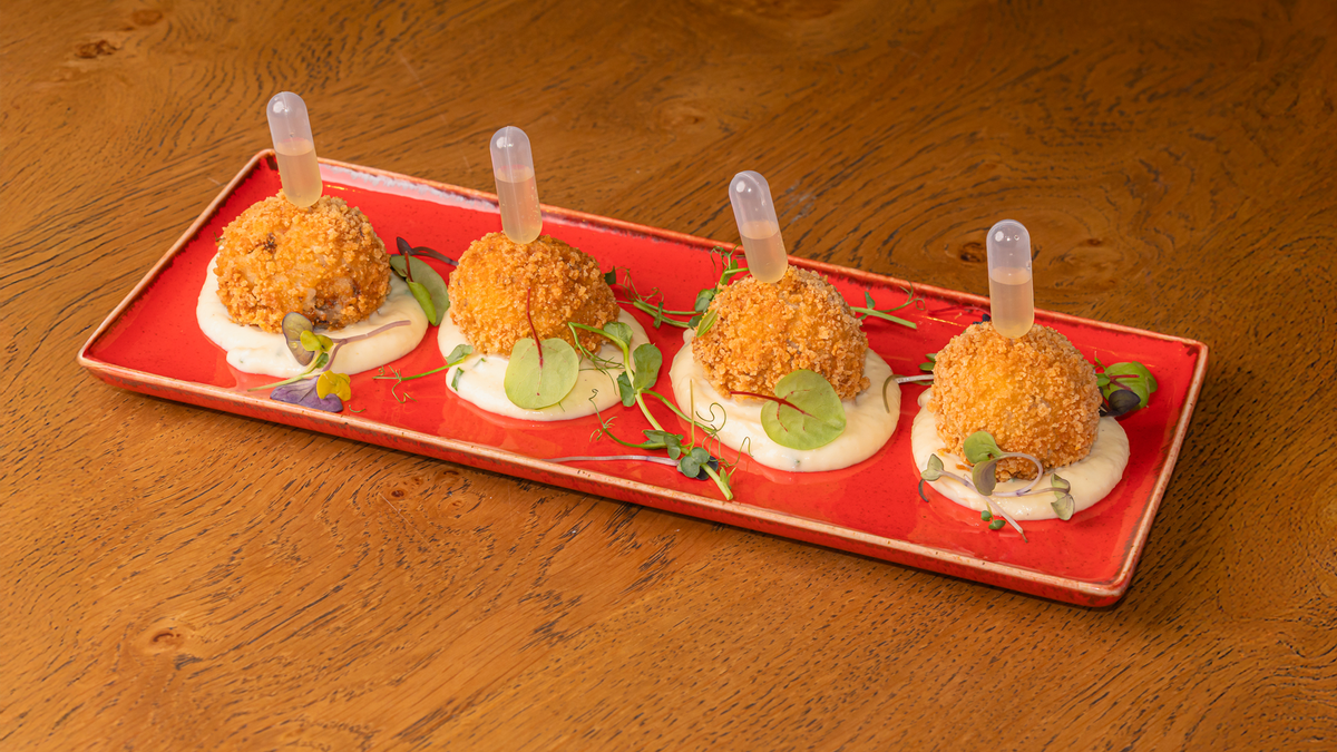 Μοτσαρέλα, ρόκα, ντοματίνια, αβοκάντο, σως πορτοκάλι, τηγανητό αυγό