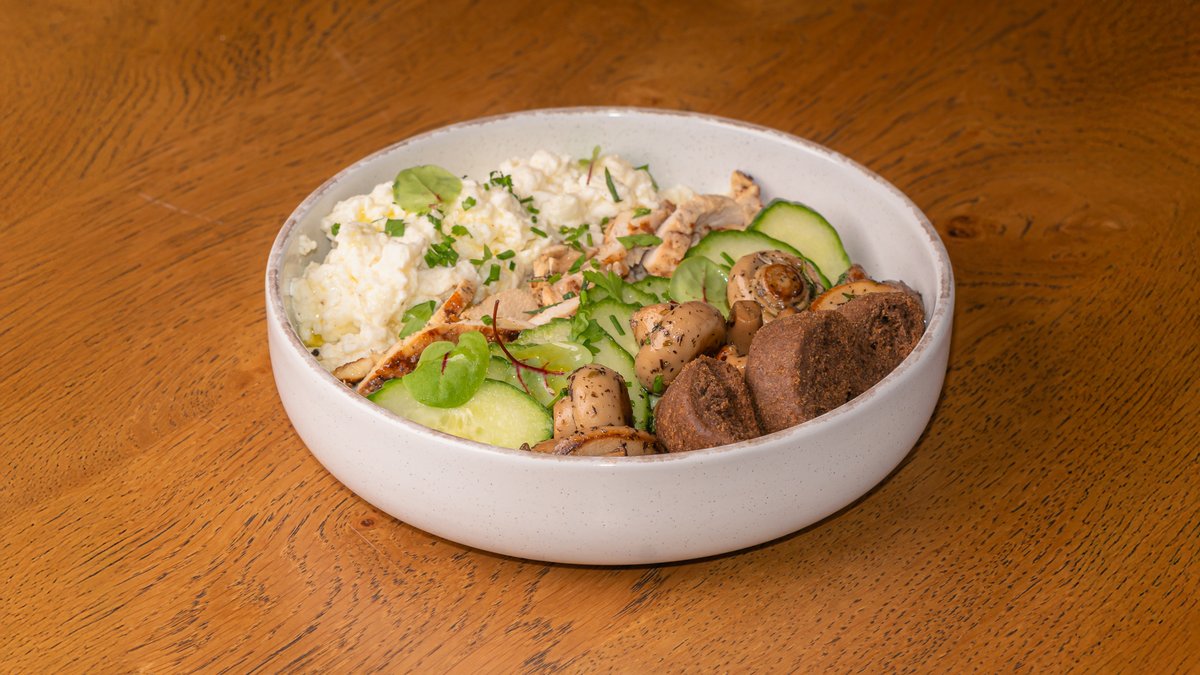Ασπράδι αυγού, κοτόπουλο, μανιτάρια, μαϊντανός, αγγούρι, παξιμάδι χαρουπιού