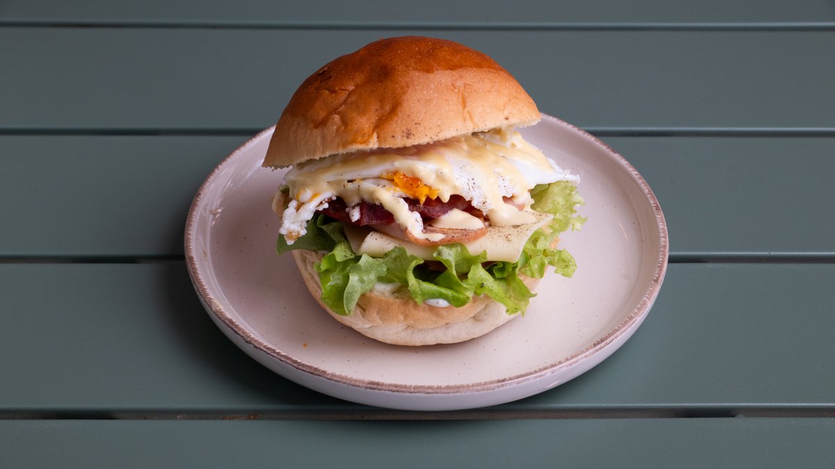 Με ψωμί brioche γαλοπούλα, τυρί, μαγιονέζα, ντομάτα, μαρούλι, μπέικον και αυγό