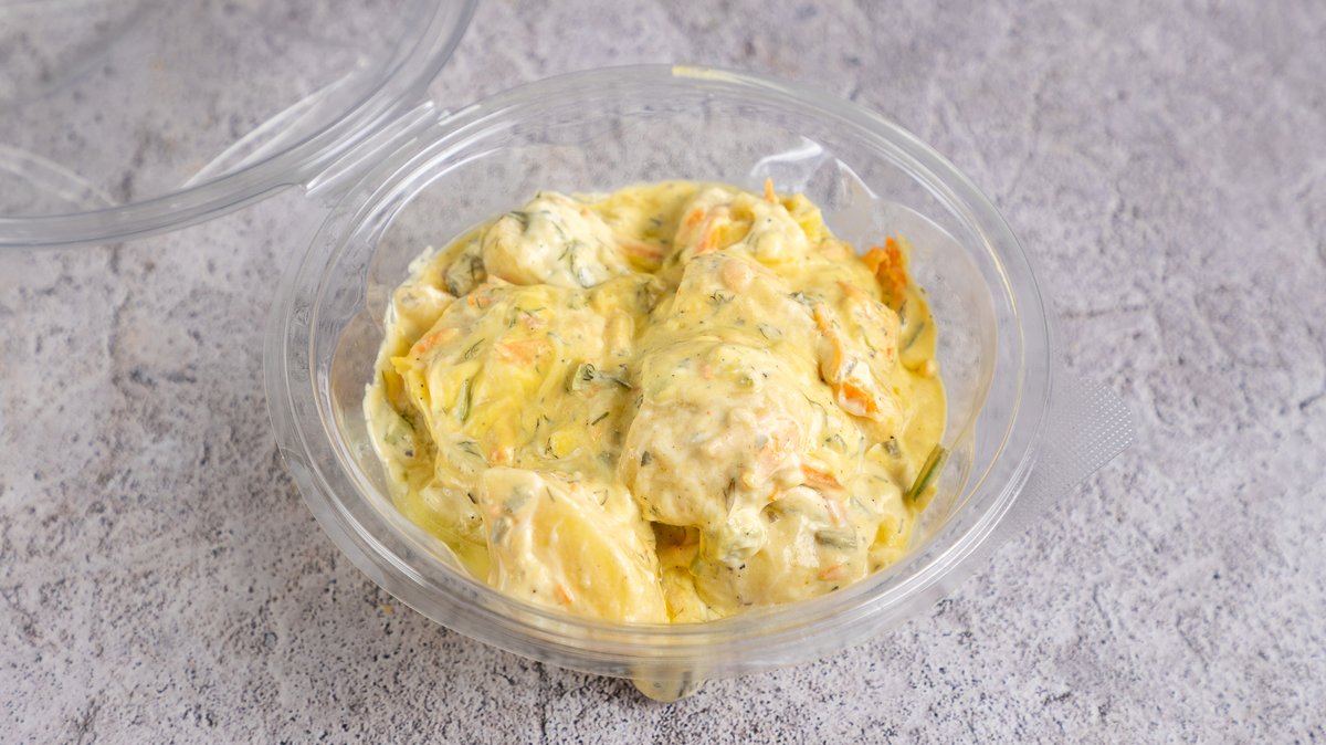 Με πατάτα, μαγιονέζα, μουστάρδα, κρεμμυδάκι φρέσκο, άνηθο, καρότο και αυγό