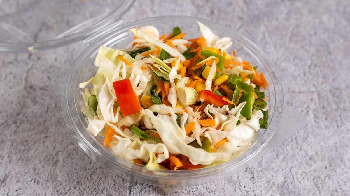 Με λάχανο, καρότο, πολύχρωμες πιπεριές, καλαμπόκι, φρέσκο κρεμμυδάκι. Συνοδεύεται από γλυκό-καυτερή σως