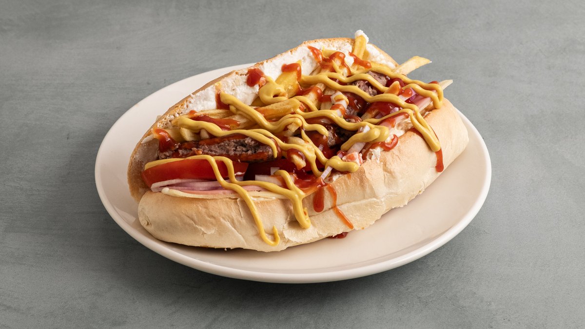Με μοσχαρίσιο μπιφτέκι, gouda, edam, καραμελωμένα κρεμμύδια, μπέικον, ομελέτα, μανιτάρια, ντομάτα, iceberg, μαγιονέζα και ketchup