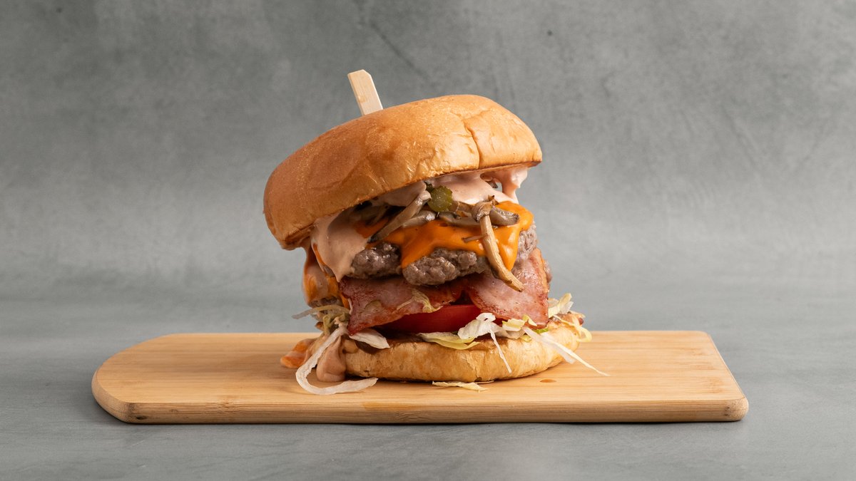 Με 2 smash μοσχαρίσια μπιφτέκια, cheddar, καραμελωμένα κρεμμύδια, μπέικον, μανιτάρια, ντομάτα, iceberg και rosemary mayo